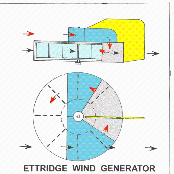 Answer: The Ettridge Wind Generator works on a spinnaker or sail principle, not as the propeller wind generators, which use an aero foil principle. We would all have seen sailing boats or yachts moving in the same direction as the wind, with a large sail puffed out to catch as much wind as possible. They can only use the spinnaker while traveling in the same direction as the wind. The normal air extractor, which is fitted to vans etc. only has two blades adjacent to one another, and relies on the fact that the curve in the blade means that one side offers more wind resistance than the other side. If both blades were flat and the same size, it would not move at all. One side of the blade is scooped, and catches the oncoming wind, while on the other side, the scoop is reversed, and deflects the oncoming wind. However it does use energy from the other side scoop to achieve this. It effectively has a power stroke for 120 degrees of one turn, while the returning scoop uses energy to be driven into the oncoming wind for 240 degrees of one turn. With the Ettridge Wind Turbine, a wind shield is positioned in the 240 degrees area, to prevent the oncoming wind acting on the turbine blade. Although this would prevent the oncoming wind acting on the returning turbine blade, the blade would be pushing the air in front of it which is trapped in the tunnel formed by the turbine blade and wind shield; so it would still be using energy in the return direction. To overcome this problem, a wind scoop is fitted above the turbine, and at the correct place, the wind is directed down into the tunnel, and forces the turbine to rotate in the direction of the wind. This means that both turbine blades are producing a power stroke, and at no time are they using up energy to be driven. It also means that more turbine blades can be fitted to give a larger surface area to resist the wind movement, providing more power to the turbine shaft. It has the same effect as the wind direction changing, and following a circular path for the sailing boat. The usual propeller used on a wind generator has two or three blades, and does not have a large surface area exposed to the wind.